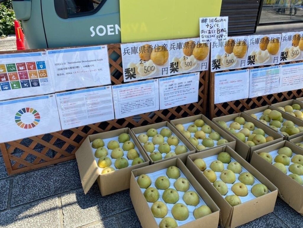 SDGs推進ブースでは、最近の雨で落ちた梨を