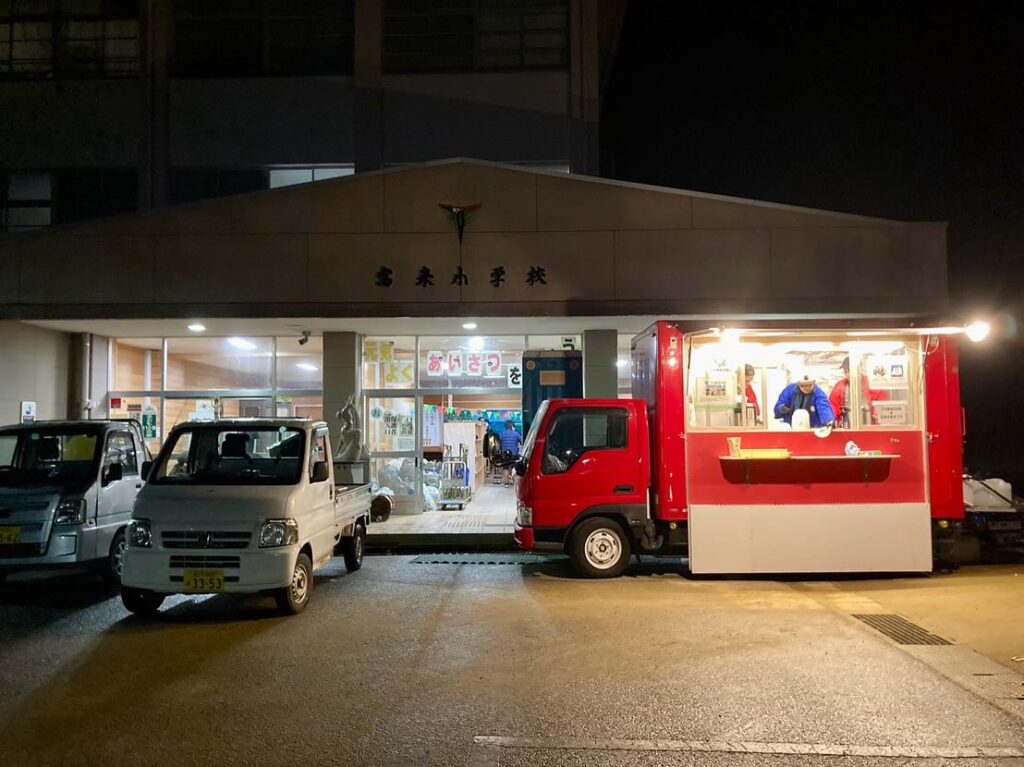 富来中学校にて、焼きそばを63食とおやつとしてクレープ85食、夜食にはうどん56食とあおさの味噌汁 15食を提供させていただきました。