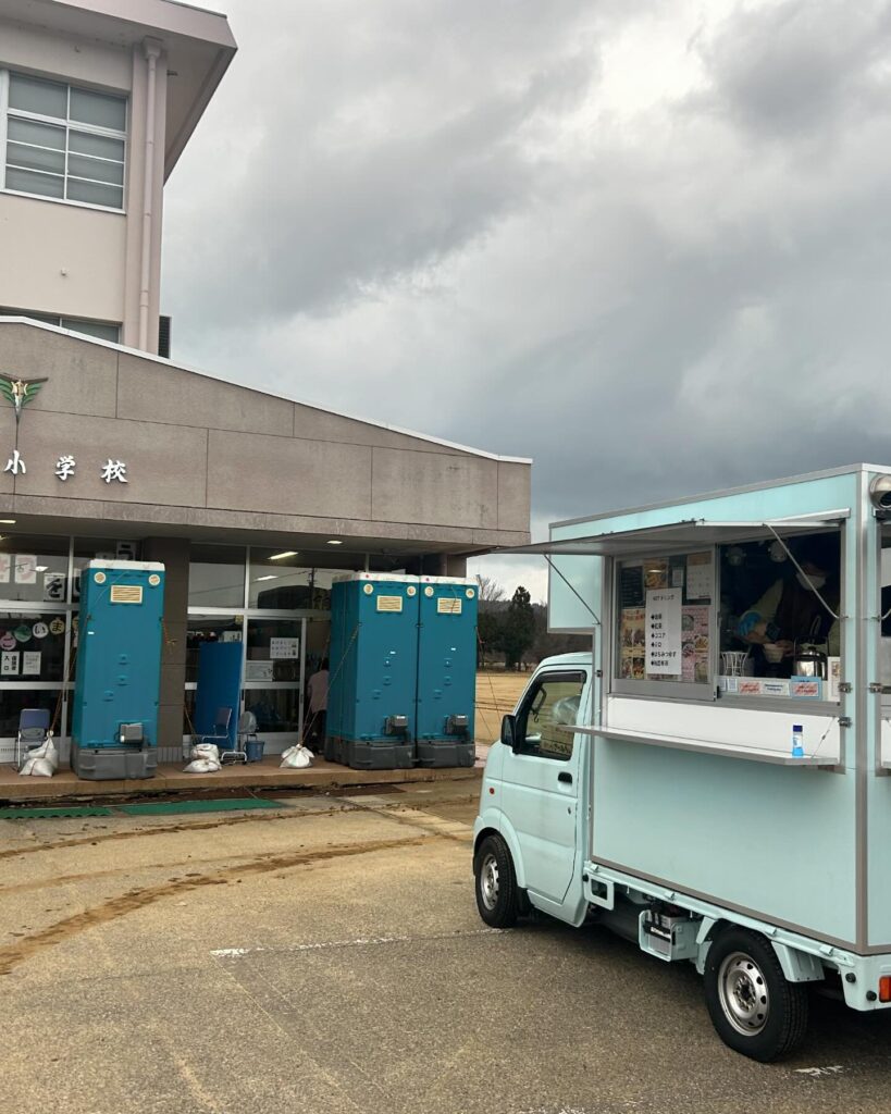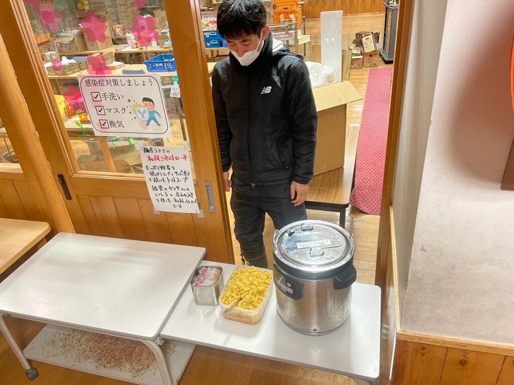 昼には富来小学校にて、焼きそばを69食、あおさの味噌汁 69食、ポテト40食。夜には志賀町役場富来支所にて、焼きそば64食、あおさの味噌汁 64食、ポテト 64食、焼き菓子、みかんを提供させていただきました。